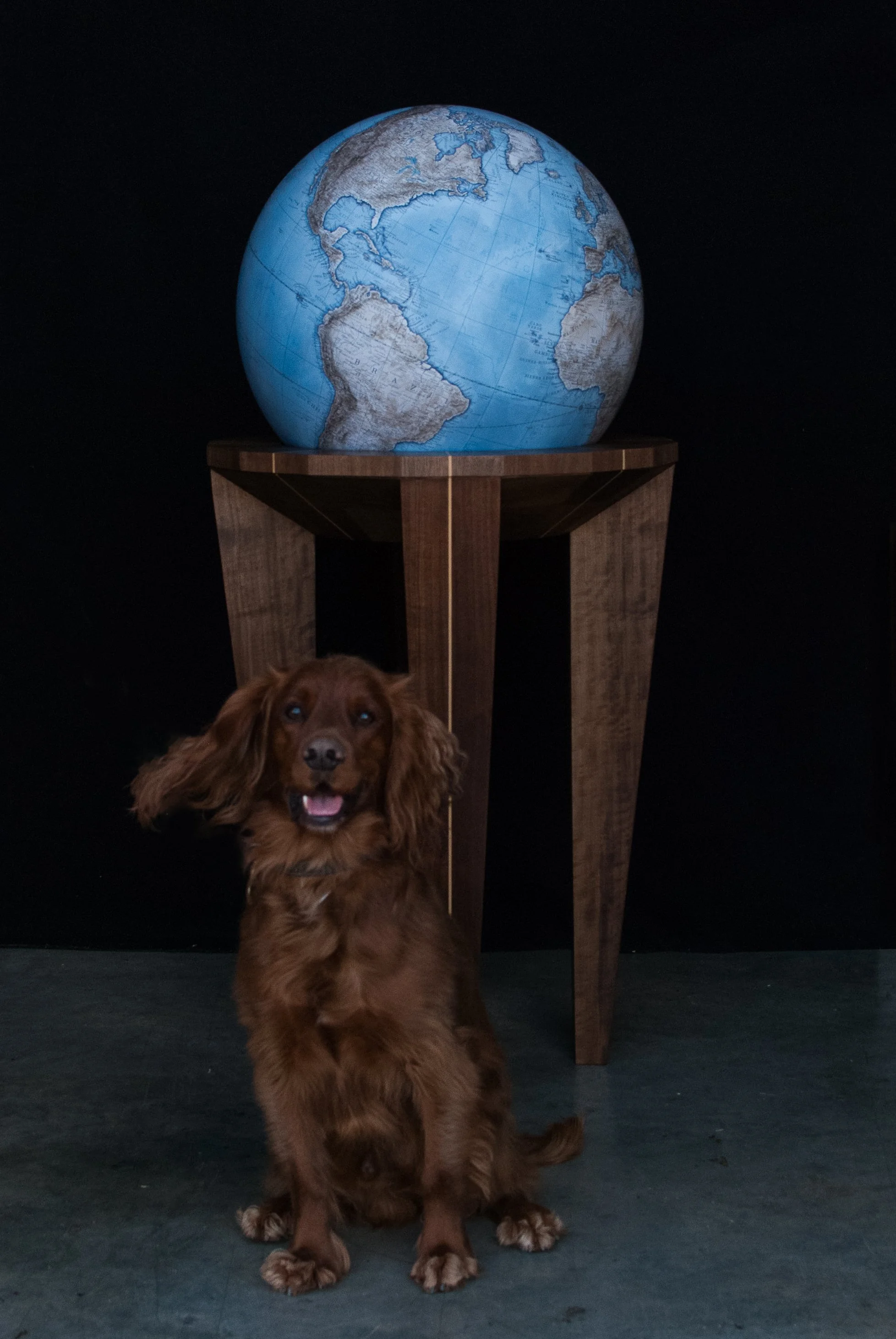 This contemporary stand is inspired by the printed horizons of historic globe stands. Elegant boxwood stringing inlaid into black walnut demarcates the cardinal and intercardinal directions, traditionally used to orient the globe to the magnetic poles.