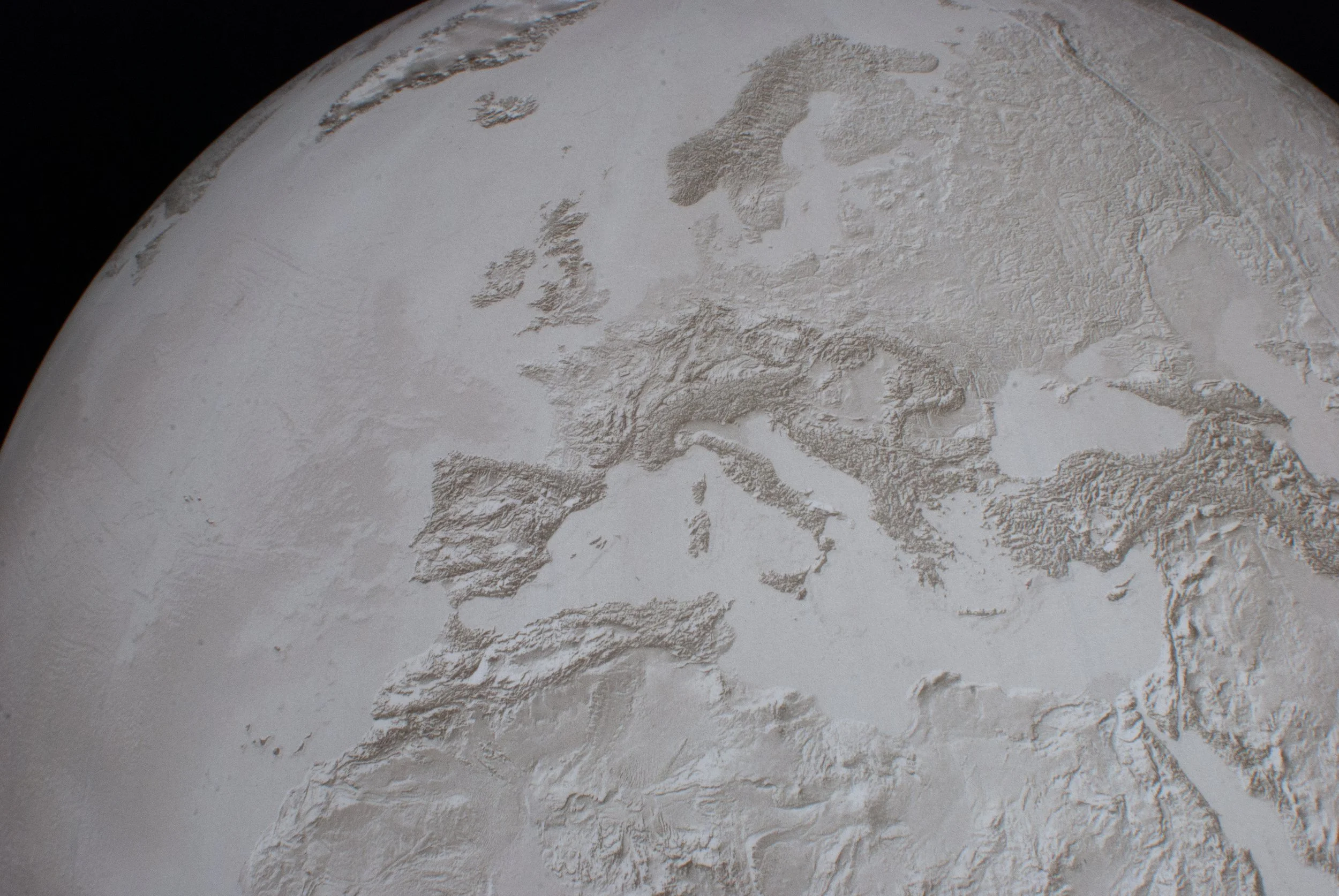 Hillshade map simulating the interplay of light and shadow across the earth’s terrain, creating a refined, classical statement piece